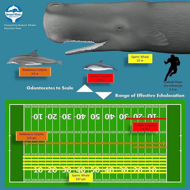 It's Whale Fact Wednesday!Echolocation is the ability to use sound to find food and navigate within your environment. All Toothed Whales, Odontocetes, can echo-locate but their size greatly affects the range that the sounds travel and effectively bounce back. Here is a infograpic that depicts animal size and their ranges in yards JUST in time for the start of NFL Regular Season! #NFLKickOff #FootballisLifeCopy and paste the following link or use DOLPHIN12 as a coupon code at www.newportwhales.com for a discounted rate to see these awe-inspiring animals:http://www.newportwhales.com/dolphin-12-special.html#newportbeach #california #orangecounty #pacificocean #newportharbor #nature #animals #wildlife #whalewatching #cetaceans #whales #ocean #wild #wildlife #science #scienceisawesome #marinescience #sea #beach #dolphins #adventure September 30, 2019 Read More