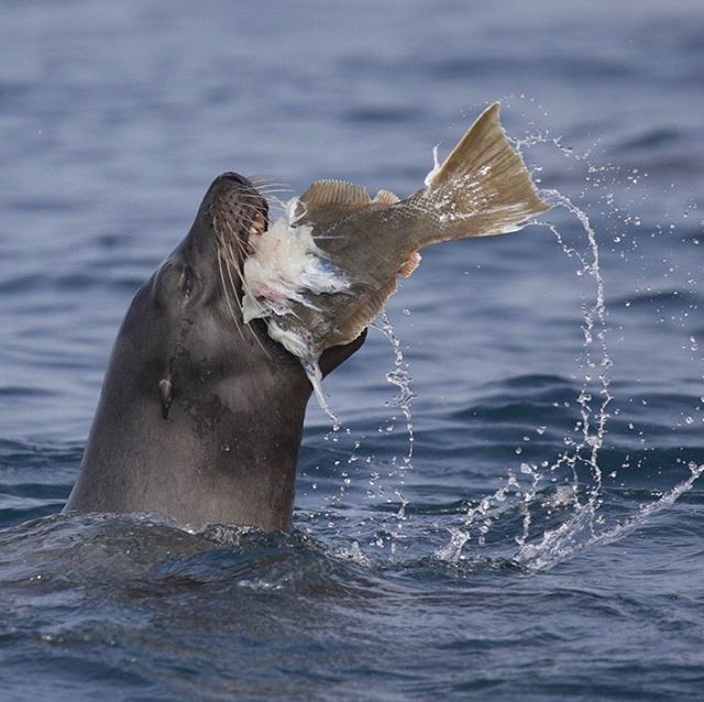 Halibut! It’s what’s for dinner! Sea lions have a varied diet that includes forage fish, larger fish (such as this halibut) and even octopus! They can’t chew their food so they thrash it at the surface to break it into manageable chunks! Photo by deckhand Kristin aboard today’s ultimate whale watch. February 21, 2020 Read More